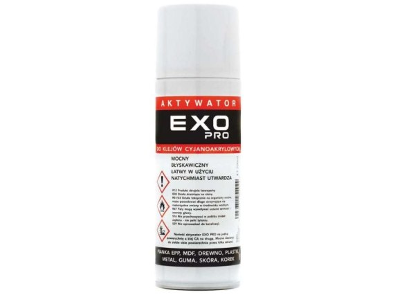 Aktywator EXO PRO to specjalistyczny produkt w postaci aerozolu, który przyśpiesza polimeryzację (wiązanie) klejów cyjanoakrylowych EXO, EXO PRO lub innych tego typu klejów dostępnych na rynku. Umożliwia klejenie grubszych spoin oraz zwiększa adhezję.
