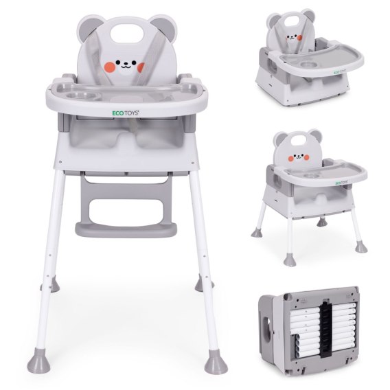 Fotelik krzesełko do karmienia dzieci 3w1 podwójna tacka 5-punktowe pasy szary ECOTOYS