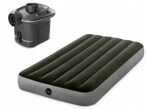 Materac welurowy INTEX o wymiarach 191x99x25 cm cm jest idealny dla wypoczynku 1 osoby. Wykonany z wytrzymałego tworzywa PVC, na górze został pokryty przyjemnym w dotyku, wodoszczelnym materiałem welurowym. Całość w przyjemnej, zielonej kolorystyce będzie pasowała do każdego wnętrza. Dzięki pompce elektrycznej w zestawie (na baterie), czas potrzebny na przygotowanie do użytku dmuchanego łóżka to 200 sekund. Zawór bostoński pozwoli w minutę spuścić powietrze, a następnie złożyć materac i schować do szafy.