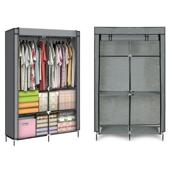 Podwijana zasłona: zamiast drzwi jak w tradycyjnej szafie, ten model posiada dwa zamki błyskawiczne i podwijany materiał, który w razie potrzebny można rozwinąć, zapiąć i dzięki temu szczelnie zamknąć swoją szafę.